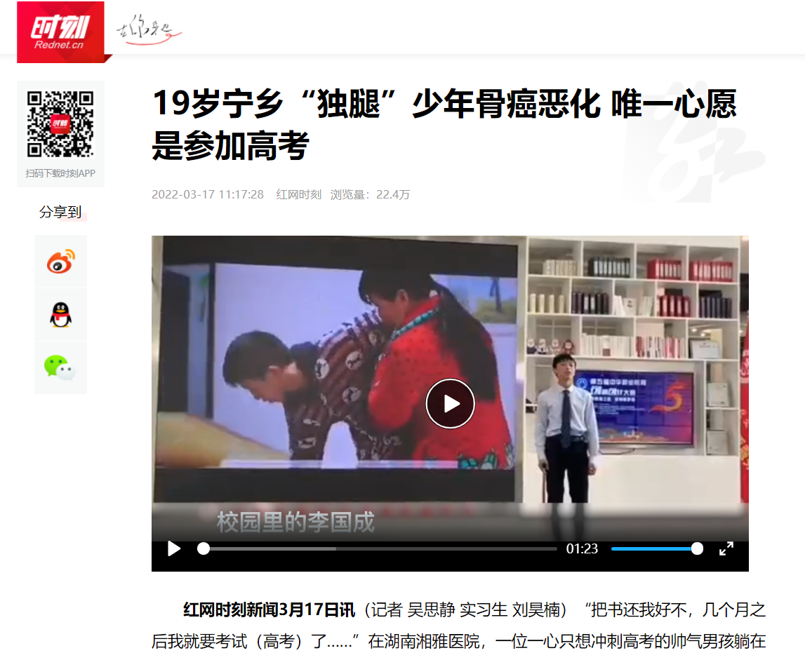 《让生命有爱无碍》追踪报道之三 主流媒体聚焦温暖工程登热搜,助力独腿男孩战病魔迎高考 湖南省温暖工程基金会官微推出《让生命有爱无碍》《励志高考学子李国成引发社会各界
