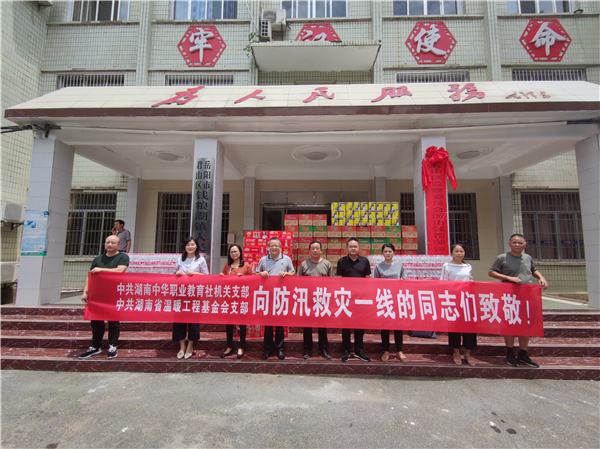 防汛重于泰山,救灾牵动人心。 7月22日,湖南中华职业教育社副秘书长周勇、湖南省温暖工程基金会理事长谭圣林等一行奔赴岳阳君山区钱粮湖镇,慰问防汛救灾一线干部群众,捐赠矿