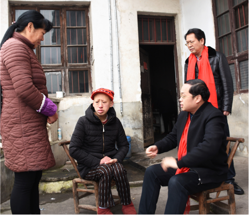 湖南中华职教社副秘书长冯立兵(左2)为残障青年的母亲王春桃送上慰问金及物资